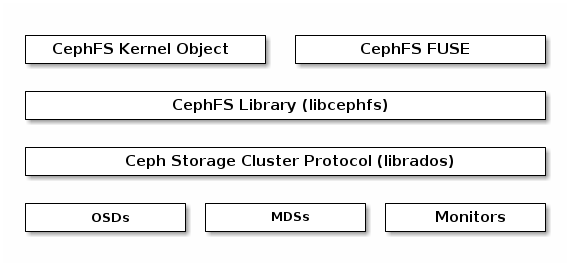 The Ceph File System (CephFS) provides a POSIX-compliant filesystem as a service that is layered on top of the object-based Ceph Storage Cluster. CephFS files get mapped to objects that Ceph stores in the Ceph Storage Cluster. Ceph Clients mount a CephFS filesystem as a kernel object or as a Filesystem in User Space (FUSE).
