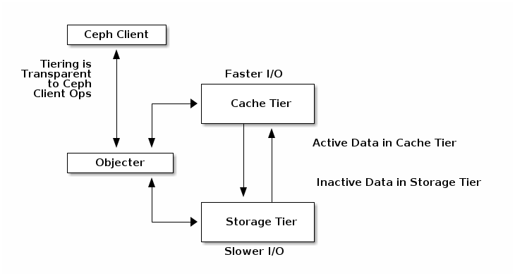 A cache tier provides Ceph Clients with better I/O performance for a subset of the data stored in a backing storage tier. Cache tiering involves creating a pool of relatively fast/expensive storage devices (e.g., solid state drives) configured to act as a cache tier, and a backing pool of either erasure-coded or relatively slower/cheaper devices configured to act as an economical storage tier. The Ceph objecter handles where to place the objects and the tiering agent determines when to flush objects from the cache to the backing storage tier. So the cache tier and the backing storage tier are completely transparent to Ceph clients.