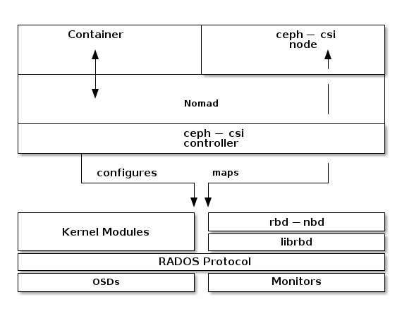 Like Kubernetes, Nomad can use Ceph Block Device. This is made possible by ceph-csi, which allows you to dynamically provision RBD images or import existing RBD images.